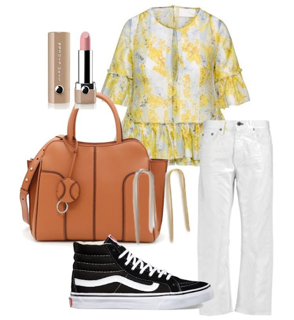 Aqui combinei com uma jeans brancas e uma camisa delicada e com padrão floral que confere um ar mais feminino a todo o conjunto.